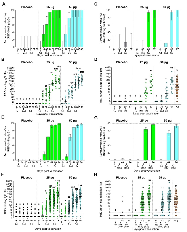 结果表明:该疫苗具有良好的耐受性和免疫原性。大多数入组者没有观察到不良反应或者为轻度或中度的不良反应,主要是红肿、注射部位疼痛、骚痒等,为重组蛋白疫苗接种后常见反应。没有疫苗相关的严重不良事件发生。接种2剂次疫苗后,76%的人可以产生中和抗体。接种3剂次疫苗后97% 的人可以产生中和抗体。抗体的几何平均滴度(GMT)达到102.5,超过89份新冠康复病人血清中和抗体水平(GMT, 51)(图1)。此外,疫苗能产生适度和平衡的Th1/Th2细胞免疫应答。